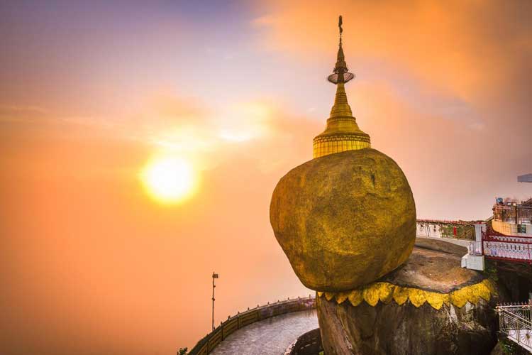 After breakfast at hotel, overland drive to Kyaikhto to go to the Golden Rock (121 miles, and approx. 4 hours’ drive). On the way, visit Allied War Cemetery. This beautifully landscaped, peaceful area is the final resting place for more than 27,000 Allied Soldiers who perished during the World War II campaign in Myanmar. Upon arrival Kim Pun base camp, change our mode of transfer to an open truck. After 11 km, we arrive at Kyaikhtiyoe (Golden Rock) which a small pagoda significant in size but unique for its position. The rock is completely covered by gold leaf and delicately balanced on the edge of the cliff.